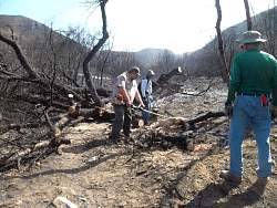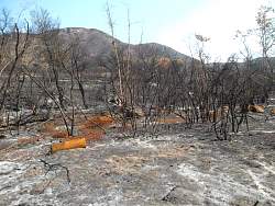 A small 'ash ghost' - the remains of a fallen tree or branch that has been completely consumed by the fire