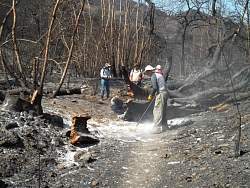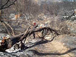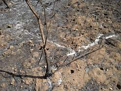 A small 'ash ghost' - the remains of a fallen tree or branch that has been completely consumed by the fire