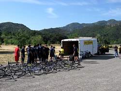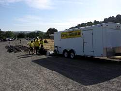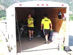 Moving the bikes out of the trailer in preparation for the ride