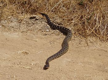 Note: The gopher snake, when frightened, will often try to imitate a rattler by hissing and shaking its tail in dry grass or leaves. If in doubt, assume it is a rattler and stay away. A gopher snake, although non-poisonous, will strike like a rattler to fend off danger. Gopher snake bites can be easily discerned from rattler bites. The gopher snake has complete sets of small, sharp teeth on both upper and lower jaws, while the rattler has only two fangs on the upper jaw. Rather than leave two deep puncture marks, the gopher snake will leave two sets of needle- like punctures, following the shape of the upper and lower jaws. Gopher snake bites can be quite painful, and the wound, like any animal bite, should be cleansed, but this snake has no venom and thus is considered harmless to humans and livestock. |