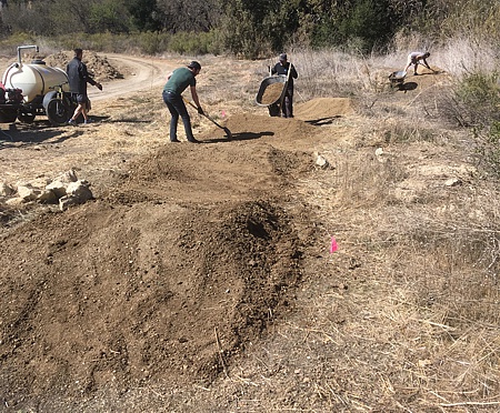 A number of companies and volunteer organizations have asked us if they could do trailwork as a team building exercise, or just to give back to the community. We are happy to work with such groups - shoot us an enquiry at trailwork@corbamtb.com for more information! For CORBA workdays, we provide lunch for participants after we're finished. Please register in advance to help us prepare by knowing how many volunteers to expect. Parents/guardians are responsible for minors at all times, and they must constantly and directly supervise children under 14. Children must be over 7-years old to attend. Please leave your four-legged friends at home! Saturday April 14: Backbone Trail Restoration from Latigo Canyon Road. CORBA and the Santa Monica Mountains Trails Council will be joining forces again to fix ruts and clear brush on this popular section of the Backbone Trail. Please register online so we'll know how many people to expect. Full details are available on the registration page. Summary of Recent Trailwork Kanan Backbone Trail work on January 13. Nineteen volunteers from CORBA and the Santa Monica Mountain Trails council fixed or installed a total of 60 drains heading up the hill (east) over 1.4 miles from the trailhead on Kanan Road. We also cut back the brush over some of that section. See the complete summary in our trailwork blog article. To see all trailwork dates, including those of other groups, visit the CORBA calendar. Join our mailing list to get updates on trailwork