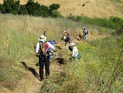 After the weeds are cut down, they have to be raked up and moved off the trail