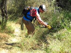 Hans with the weed whip, cutting down the tall grass other small plants