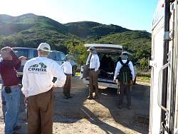 At the trailhead, Santa Monica Mountain Trails Council members get their tools together