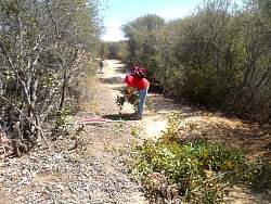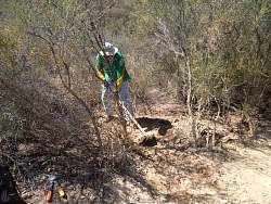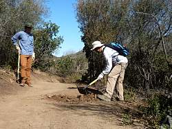 Steve demonstrates how to clean out a drainage dip filled with sediment. You start with a pick-mattock to loosen up the dirt if it's packed down (which it was!)