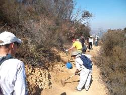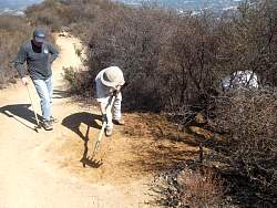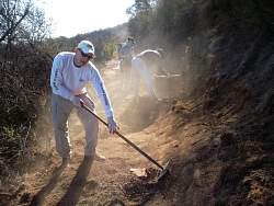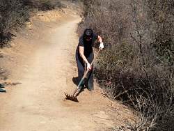 Working on another drainage nick. The pupose of the nick is to capture the water that runs down the trail and funnel it off. This keeps water from eroding deeper ruts in the middle of the trail.