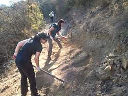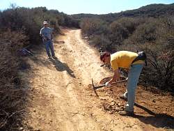 Volunteers work in pairs when building drainage nicks. While one works, the other rests. Then they switch.