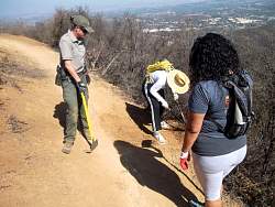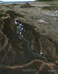 View of the Space Mountain trail, courtesy of Google Earth, looking west. The trail is light blue and the locations where we did work are shown by the white markers.