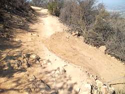 Here you can see how the slough (junk that has fallen on the trail from above) covers about 2/3 of the usable width of the trail. With a wider trail, it's easier to pick a line, pass oncoming people, and avoid riding too close to the soft edge and risk a tumble.