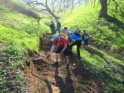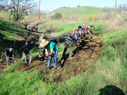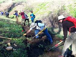 Mtn bike team members, coaches and parents from Calabasas and Simi Valley work on a new trail to bypass the swamp.