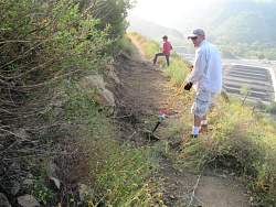 We also broadened and smoothed the trail where slough and vegetation had built up on the inside. 'Slough' is dirt and rocks that fall down from the hillside above and builds up on the inside edge of the trail.