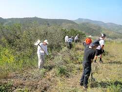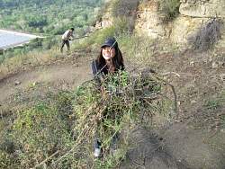 Covering up the closed trail with brush and cuttings to keep people off it. It will also shade new plants to help them get started.