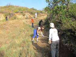 Cuttings are being piled beside a section of the trail that will be closed down. Another group is working on the new trail that will bypass the section to be closed.