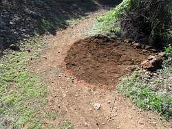 Most of the effort went into fixing ruts and digging drainages to keep them from getting worse, or from forming in the first place. We start by scraping off the vegetation so it doesn't get pulled onto the trail.