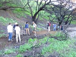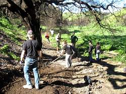 Armoring a big rut with rocks to keep it from eventually cutting across the trail